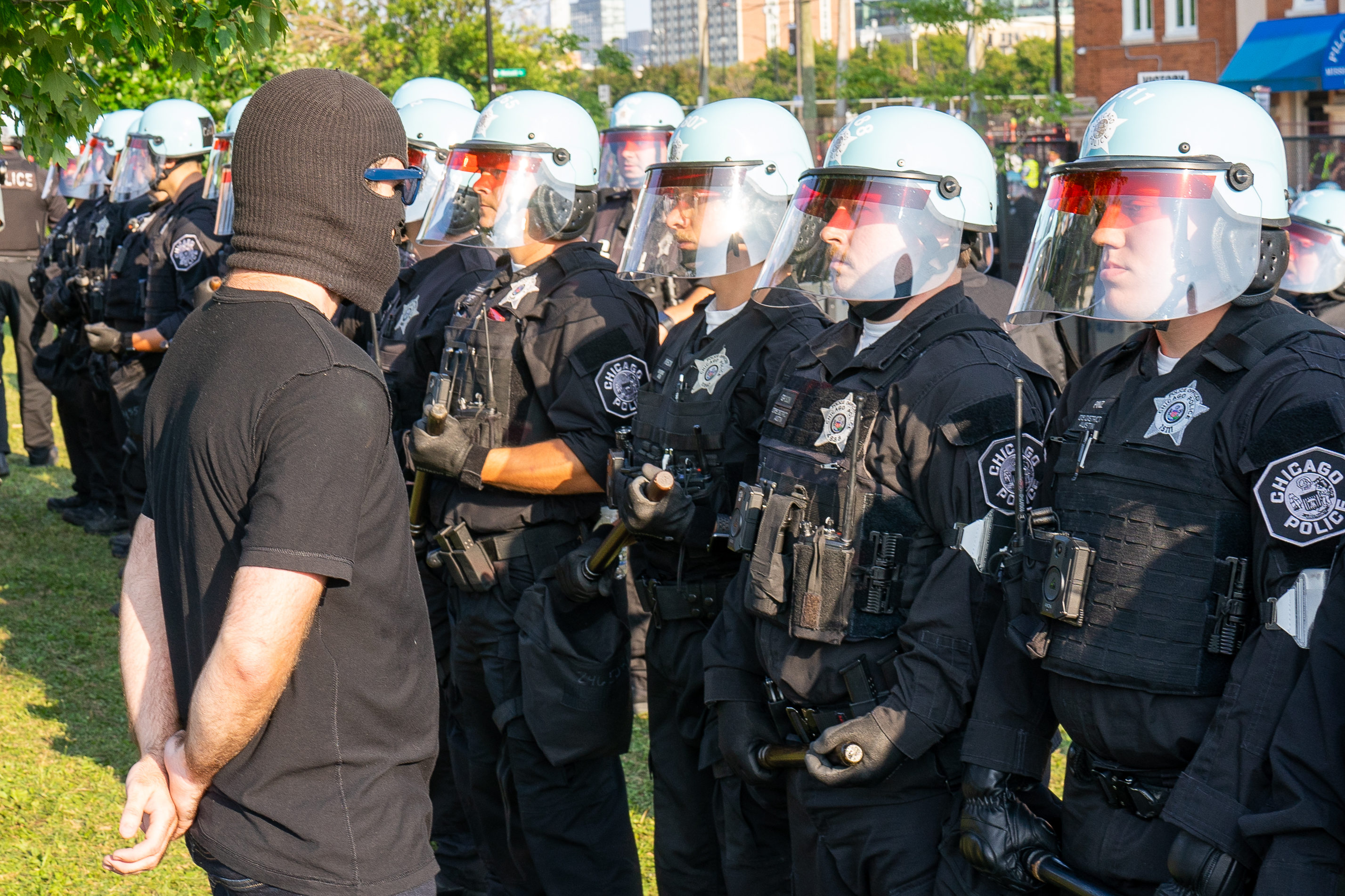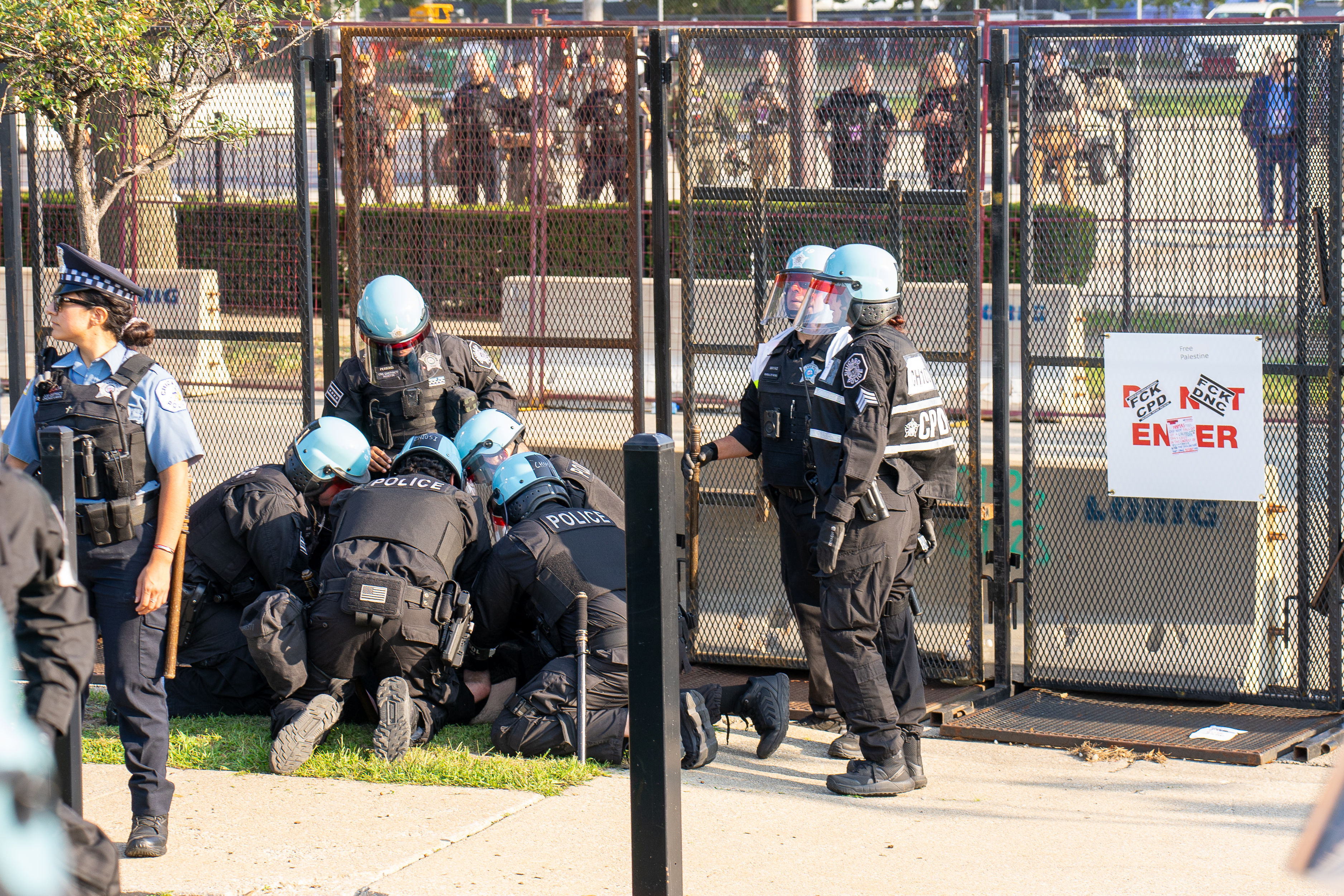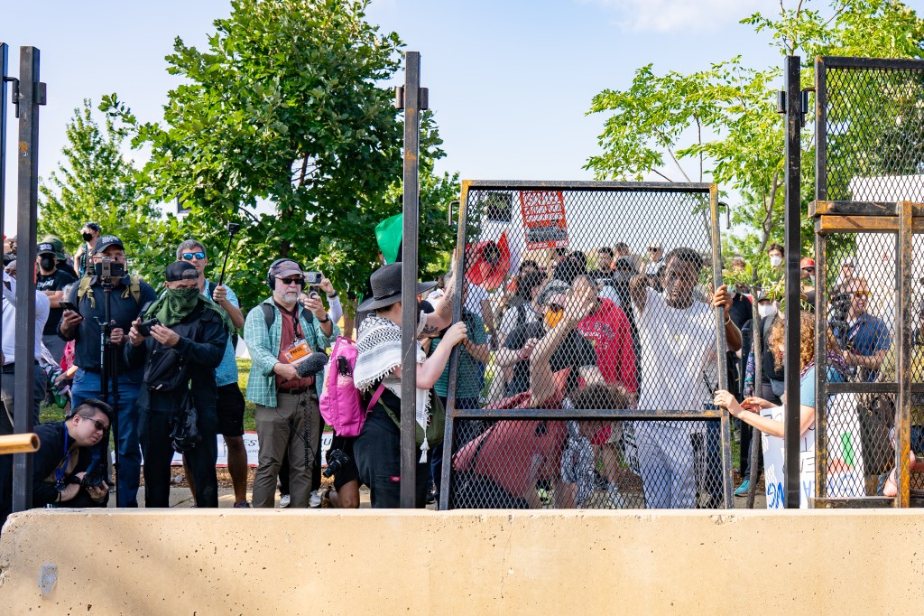 Eventually we got to a park that was in sight of the United Center and the crowd disbursed. People found shade to sit down. Others climbed on playground equipment. A makeshift stage was set up and a big crowd gathered around that. But then the group looking for trouble pushed up against the barrier at the edge of the park facing the United Center.