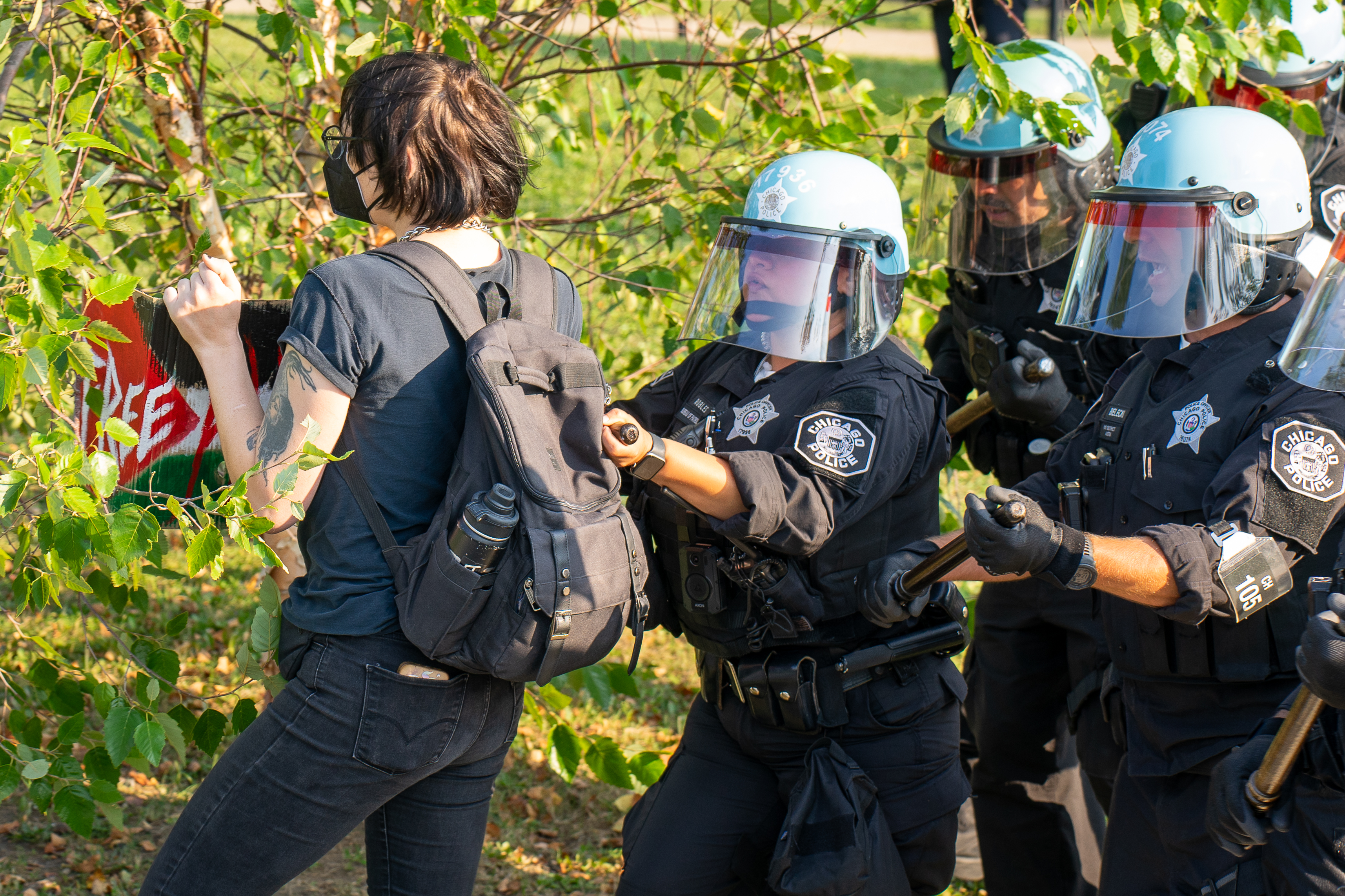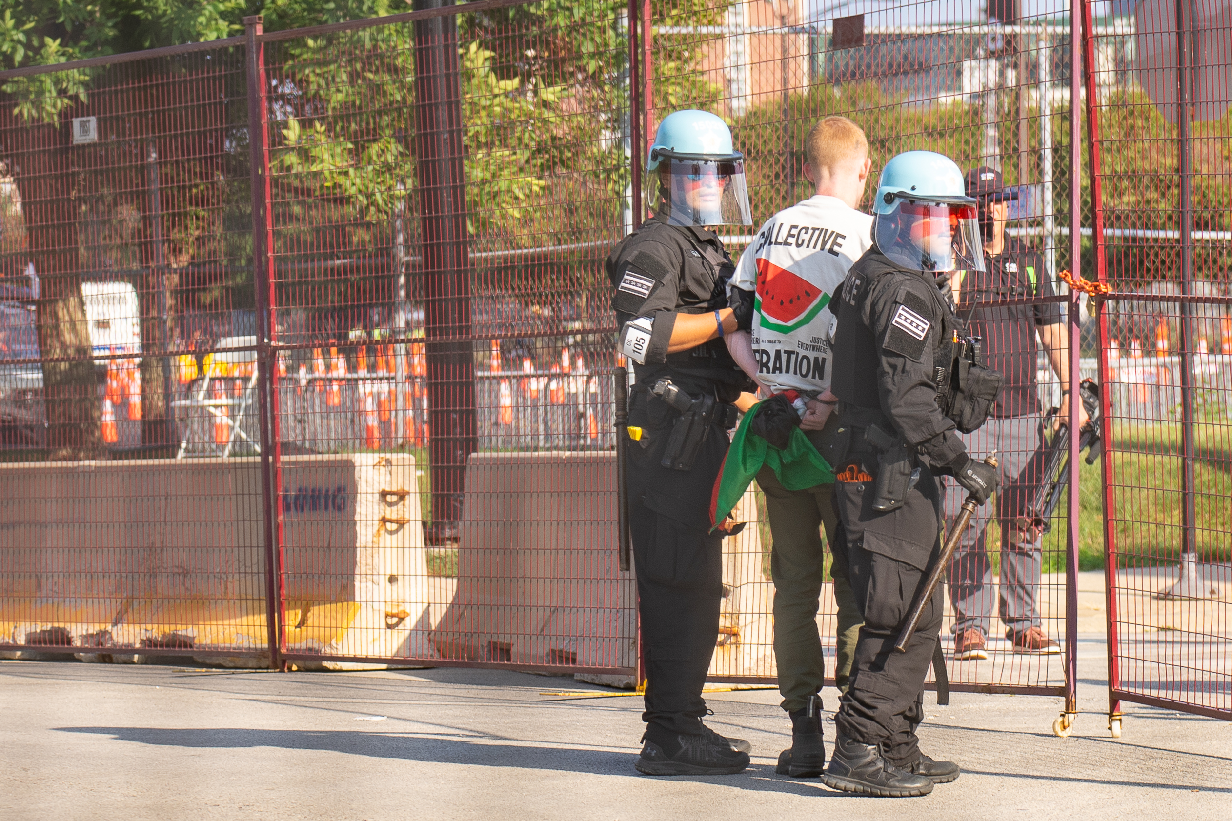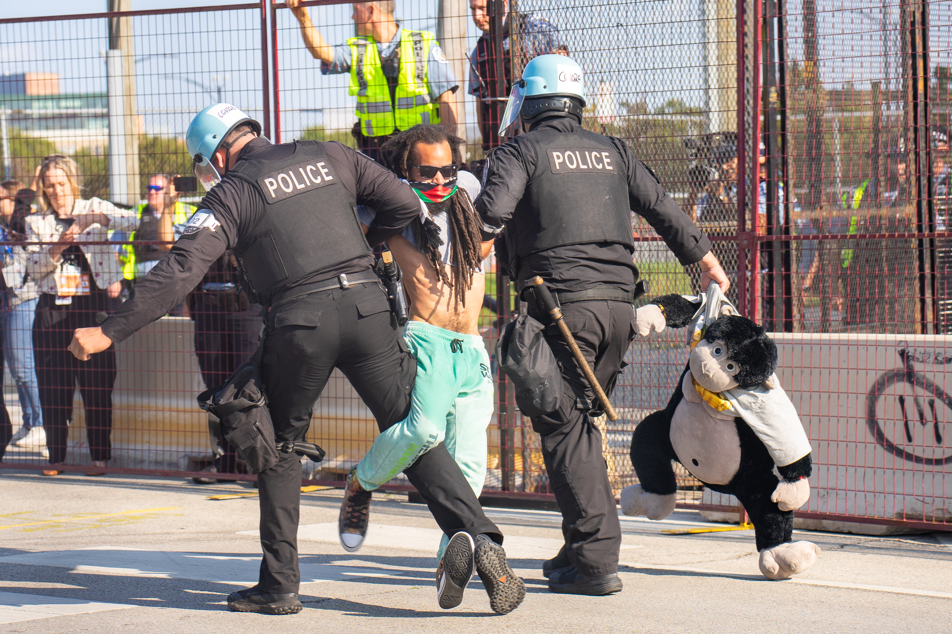 Eventually we got to a park that was in sight of the United Center and the crowd disbursed. People found shade to sit down. Others climbed on playground equipment. A makeshift stage was set up and a big crowd gathered around that. But then the group looking for trouble pushed up against the barrier at the edge of the park facing the United Center.