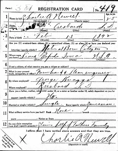This Memorial Day I remember 25-year-old Private Charles A Newell of Cresbard, South Dakota, who died on October 17, 1918 at Camp Lee in Virginia. He was part of the Veterinary Training School preparing to serve overseas in World War I. Rather than one of the 53,000 US soldiers who died in combat, he was one of the 45,000 who died of influenza after being drafted (see his registration card on the right).